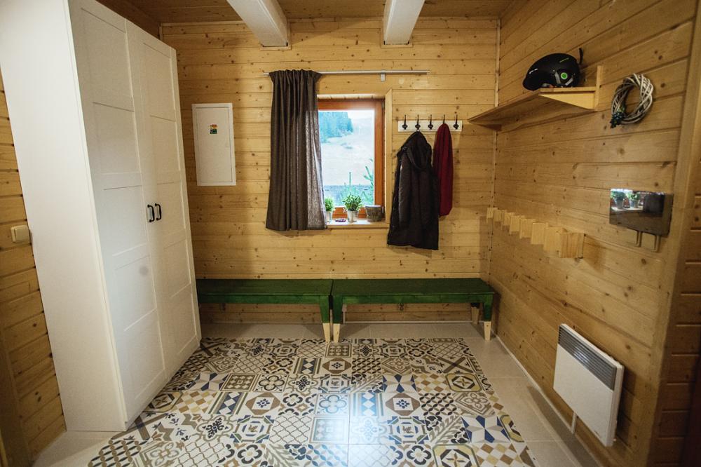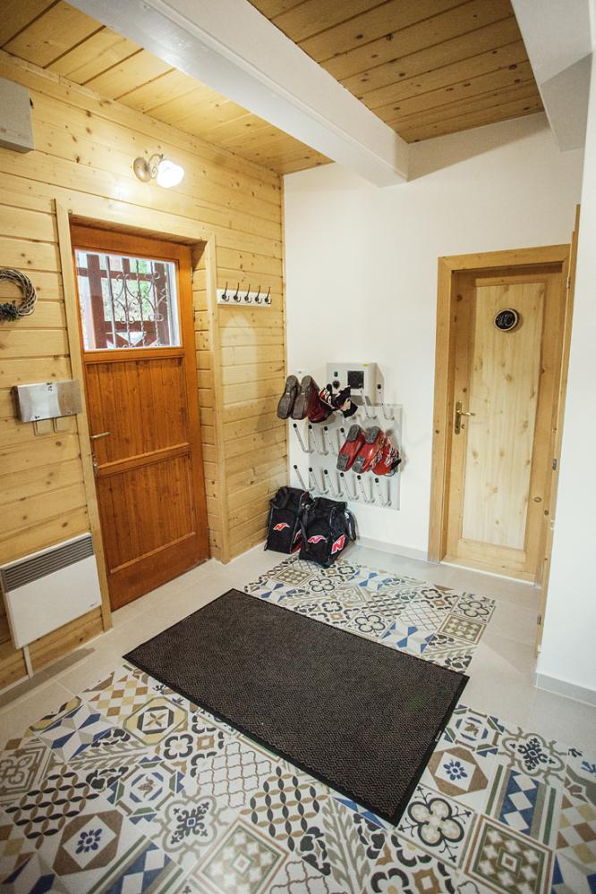 Entrance hall provides space for skis, boots and strollers. It includes a ski boot drier, hangers, shelves for helmets, stand on skis and wardrobe. Advantage of this room is underfloor heating.