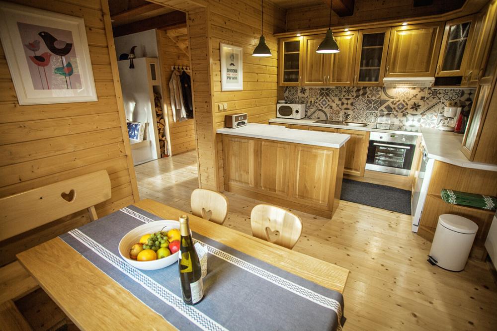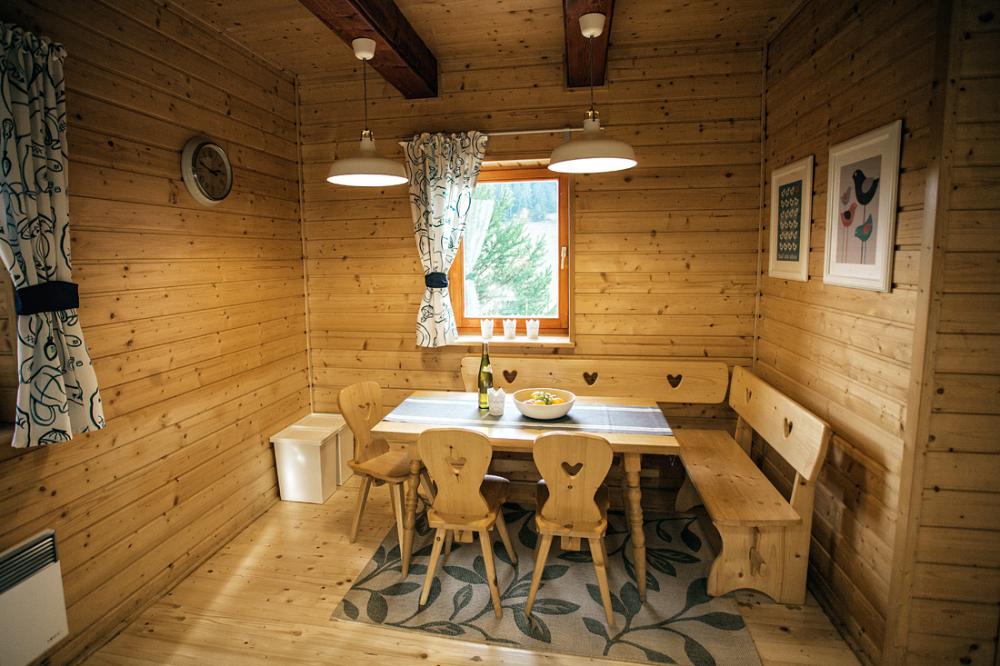 Dining area has a spacious table with benches and chairs. Small bar offers also 2 seats with his stools.