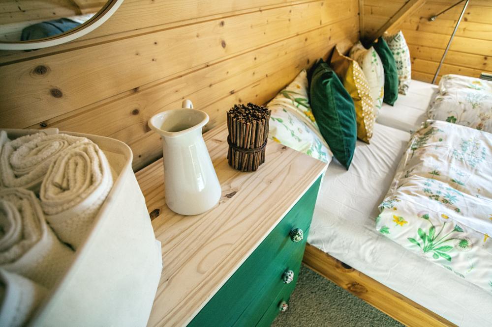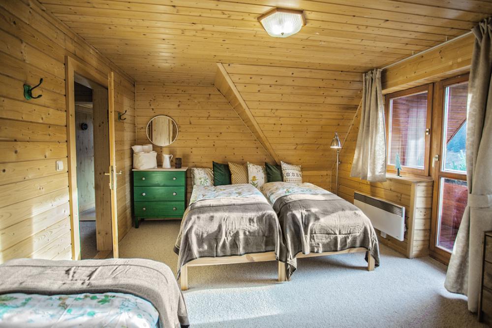 Butterfly room is furnished with comfortable beds kind of spring box beds. There is one double bed and 2 single beds. Two chest of drawers are appropriate compliments for this room. All room is decorated to a natural colours with a turquoise colour as addition.