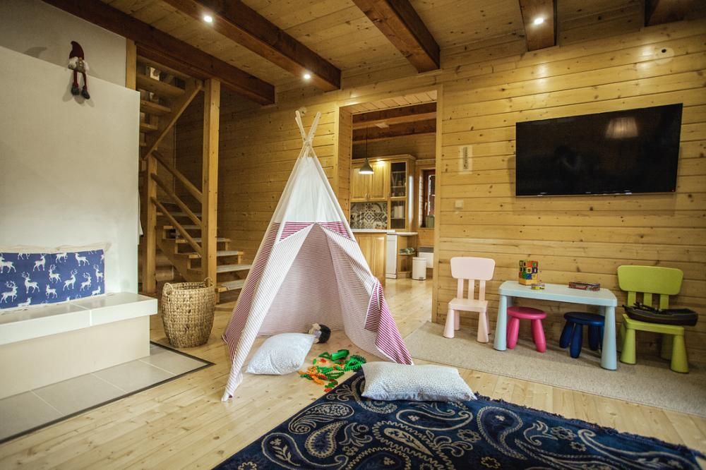 Part of the living room is also a children's play area with a carpet, table with chairs, some toys, games and last but not least amazing teepee tent by Elen living.