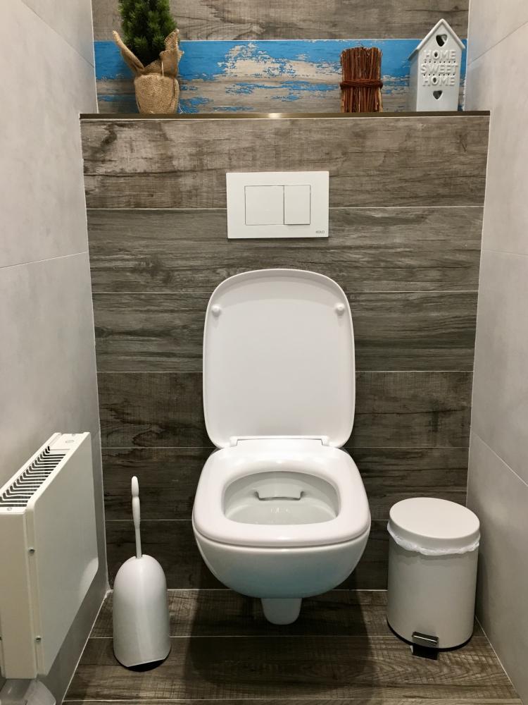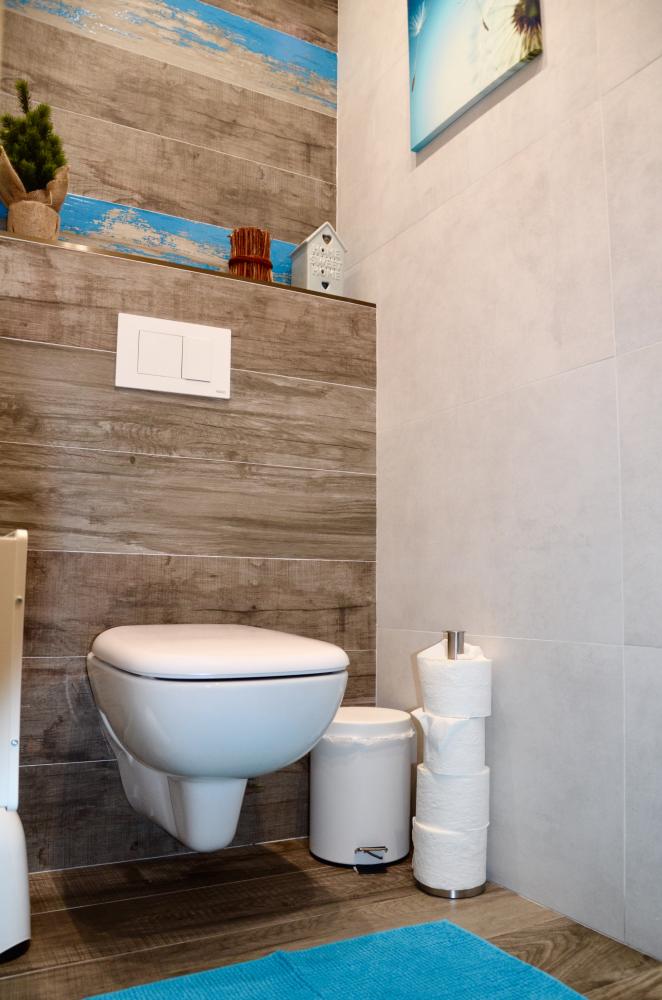 The bathroom has a shower, double sink and hair dryer. In this bathroom is floor heated by underfloor heating. Toilet is separately from bathroom with a small wash basin.