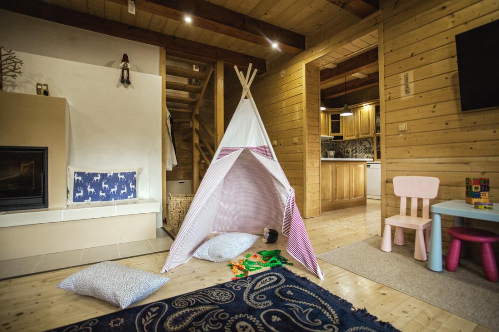 Príjemnú atmosféru v spoločenskej miestnosti doplňuje krb s akumulačnou jednotkou s výhrevom až 12 hodín. Drevený interiér tejto miestnosti je umocnený pohodlnou pohovkou v modernom ľudovom štýle, kobercom, LCD televízorom a náladovou lampou. Súčasťou tejto miestnosti je aj detský kútik s kobercom, detský stôl so stoličkami, rôzne hračky, spoločenské hry pre deti a v neposlednom rade úžasný detský indiánsky stan - Teepee, značky Elen Living.